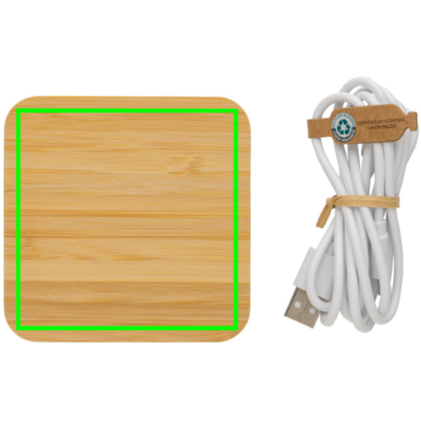 Snabb 10W trådlös laddare med hölje i FSC® 100% bambu. med två USB portar på framsidan Trådlös laddning är kompatibel med alla QI-aktiverade enheter som senaste generationen Android, iPhone 8 och upp. 150cm laddningskabel i RCS certifierad TPE medföljer. Produkt och accessoarer är 100% PVC-fria. Levereras i FSC® mix kraft förpackning. Type-C in; Input 5V/2A; 9V/2A; trådlös output 5V/1A;9V/1.1A (10W)