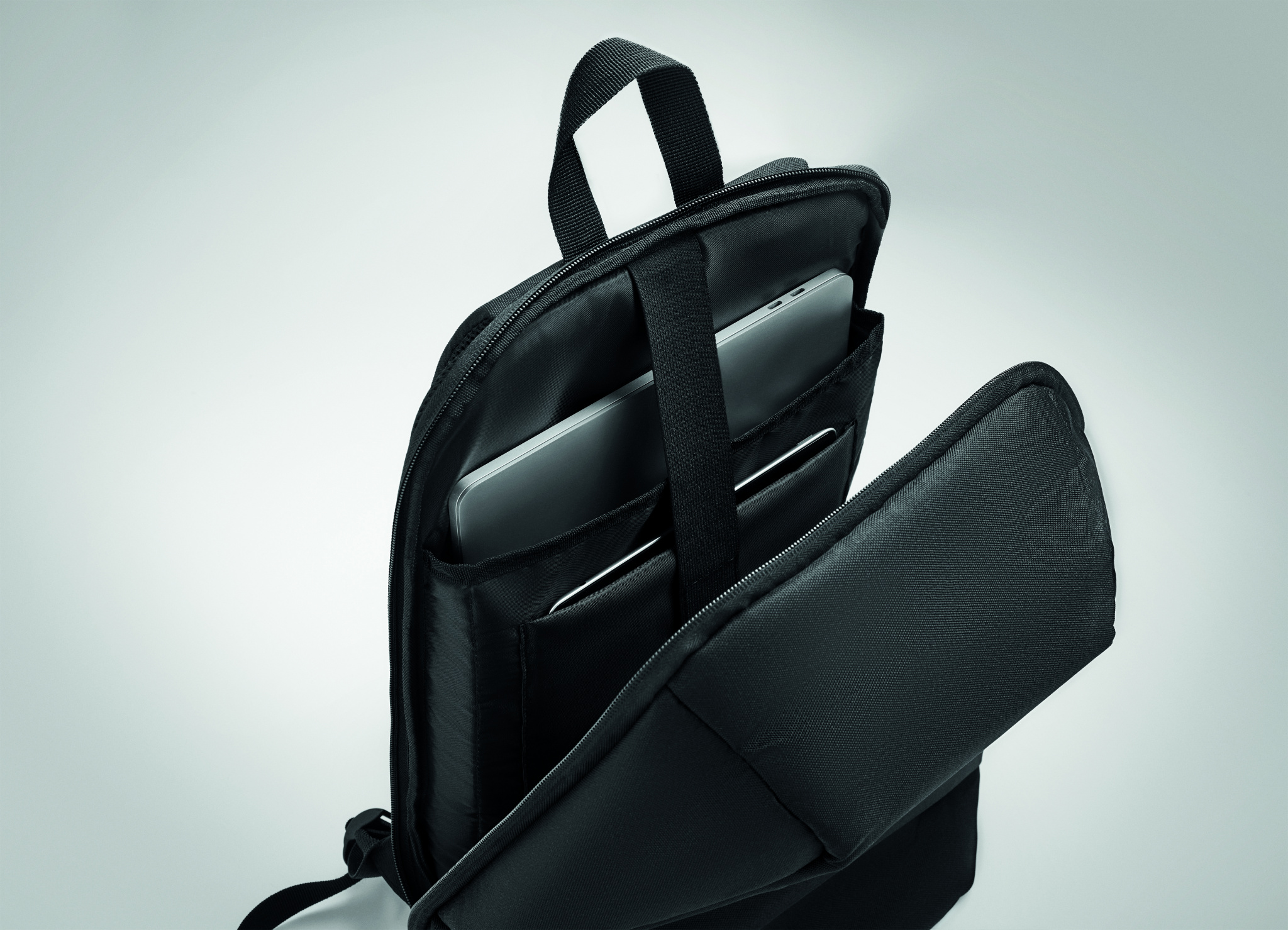 15 tums stöldskyddad dataryggsäck för bärbar dator i 600D RPET polyester. Har flera fack varav ett extra vadderat för surfplatta med mera. Vadderade axelremmar och huvudfack på baksidan.