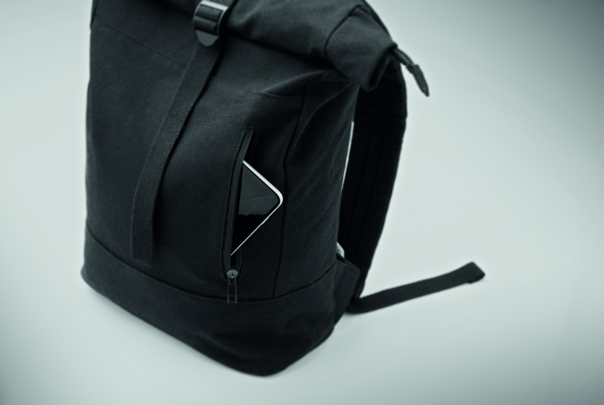 15'' dataryggsäck med dragkedja och rullstägning i återvunnen bomull och återvunnen polyester (70%/30%). Ficka med dragkedja på framsidan. Vadderad rygg och axelremmar. 340gr/m².