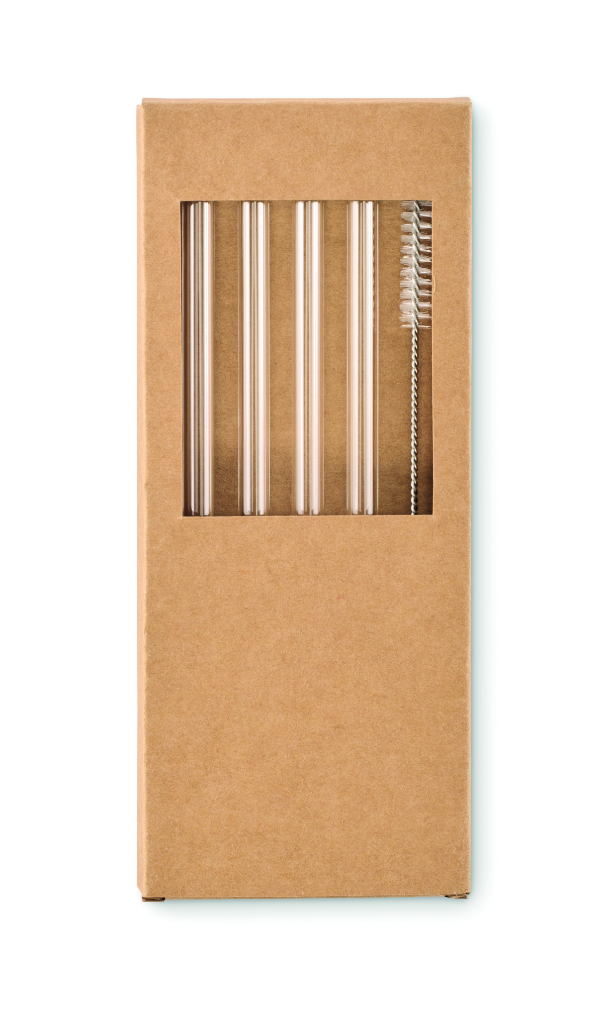 Förpackning med 4 återanvändbara sugrör i borosilikatglas med 1 rengöringsborste.