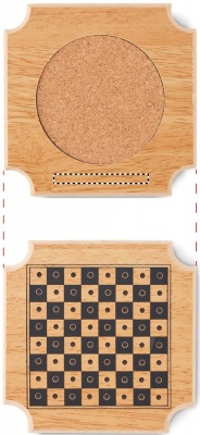 Set med 4st drickunderlägg av kork och MDF inklusive ett 4-spelsset: Tic-Tac-Toe, Backgammon, Schack och Kinesiskaschack.