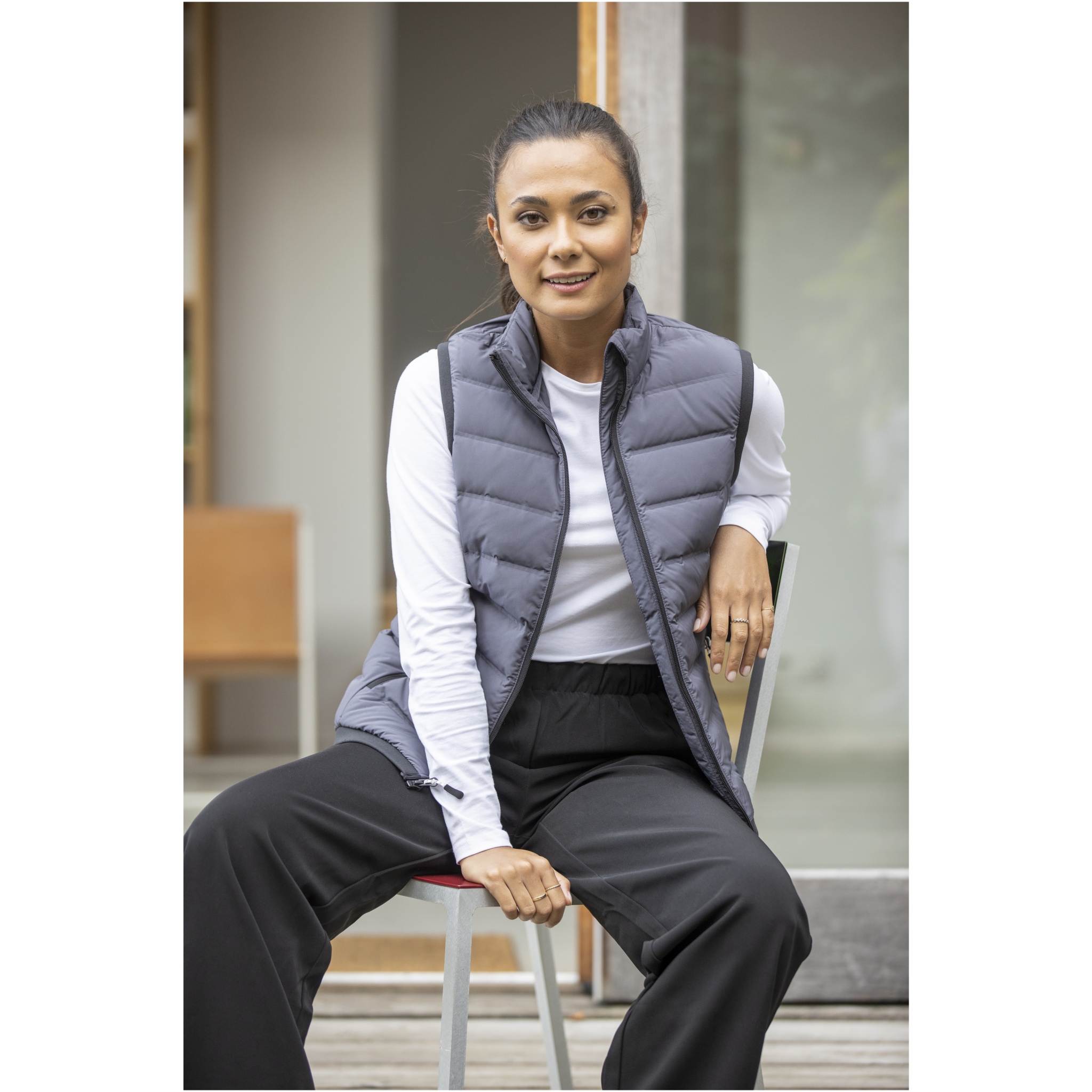 Caltha isolerad dun bodywarmer för damer - ett mångsidigt och miljövänligt ytterplagg. Tillverkad av 164 g/m² 750T vävt dubbelskiktat pongee-tyg i polyester. Det matta tyget i kombination med värmeförseglad quiltning ger kroppsvärmaren en modern look samtidigt som den totala isoleringsförmågan förbättras. Med RDS-certifierad återvunnen dunisolering av återvunnet dun och återvunna fjädrar får du värme utan att kompromissa med etiska standarder. Med invändig stormklaff, hakskydd och flatstickade elastiska ribbade muddar i ärmsluten ger denna bodywarmer maximalt skydd mot väder och vind. Frontfickorna med dragkedja ger extra bekvämlighet och funktionalitet. Omfamna både stil och etiska värderingar med Caltha bodywarmer perfekt för alla utomhusäventyr eller daglig användning. Denna bodywarmer är designad med en figurnära form för en feminin look.