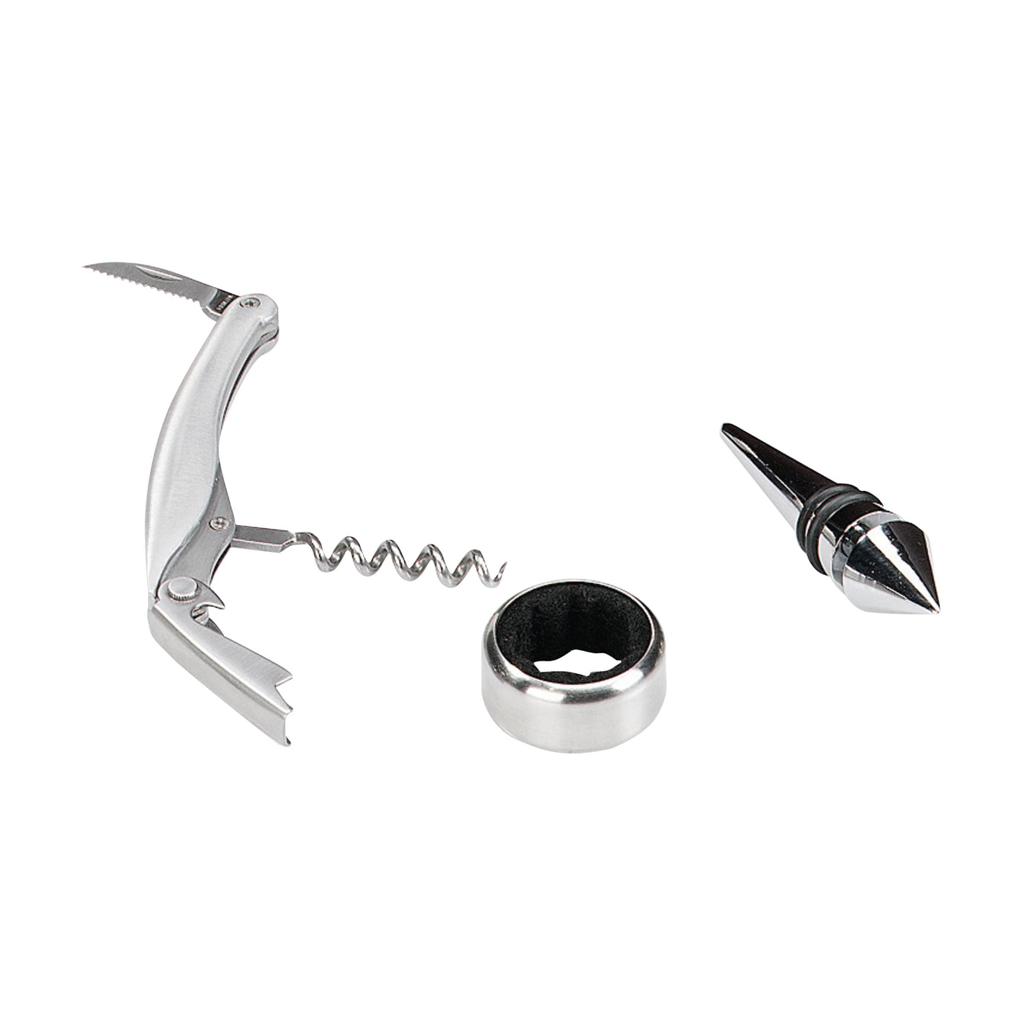 Elegant vinlåda i trä med droppfångare, flaskpropp och servitörer i rostfritt stål. Exkl. vin. Artiklar levereras som ett set i en brun kartong.