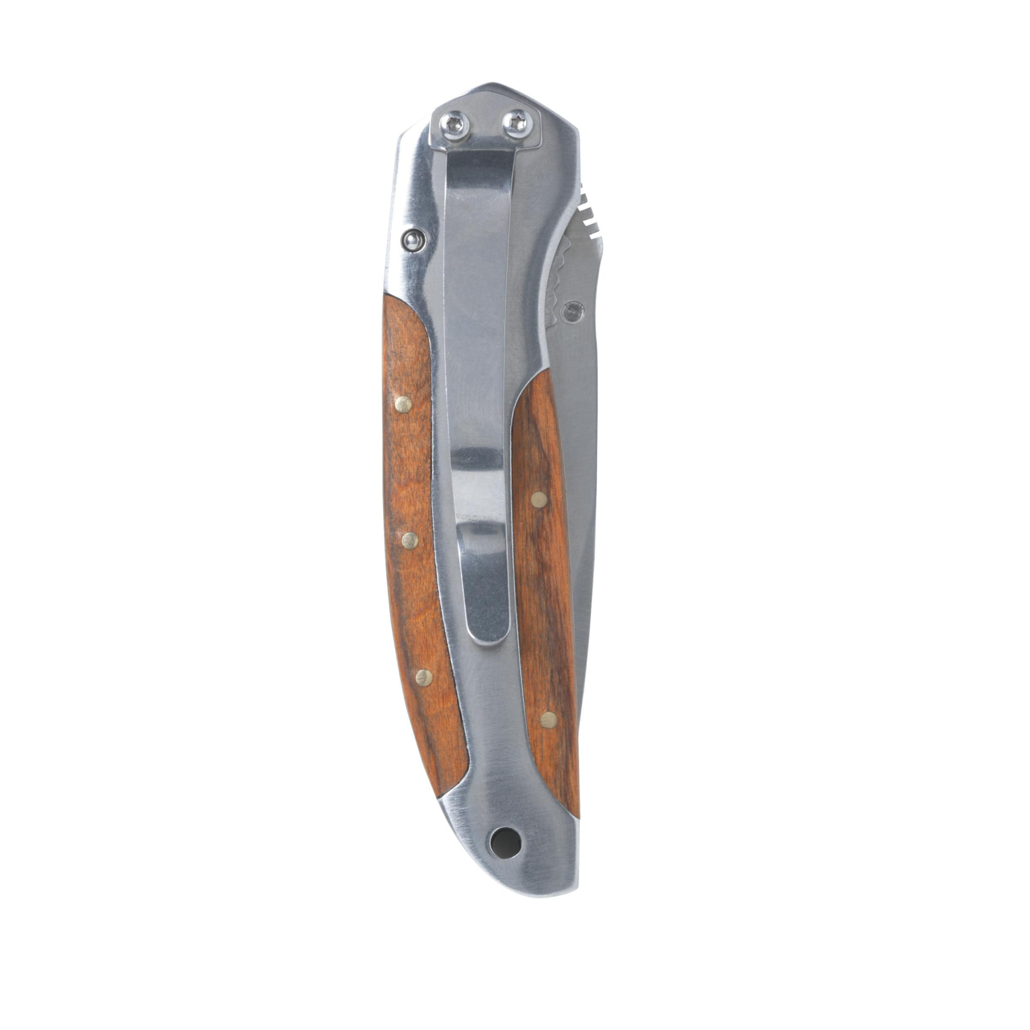 Robust överlevnadskniv i rostfritt stål med sågtandat eggblad, träinlägg i handtaget och praktisk klämma. Observera att lokala regler kan gälla för innehav och/eller bärande av knivar eller multiverktyg offentligt. Varje föremål levereras i en individuell brun kartong.
