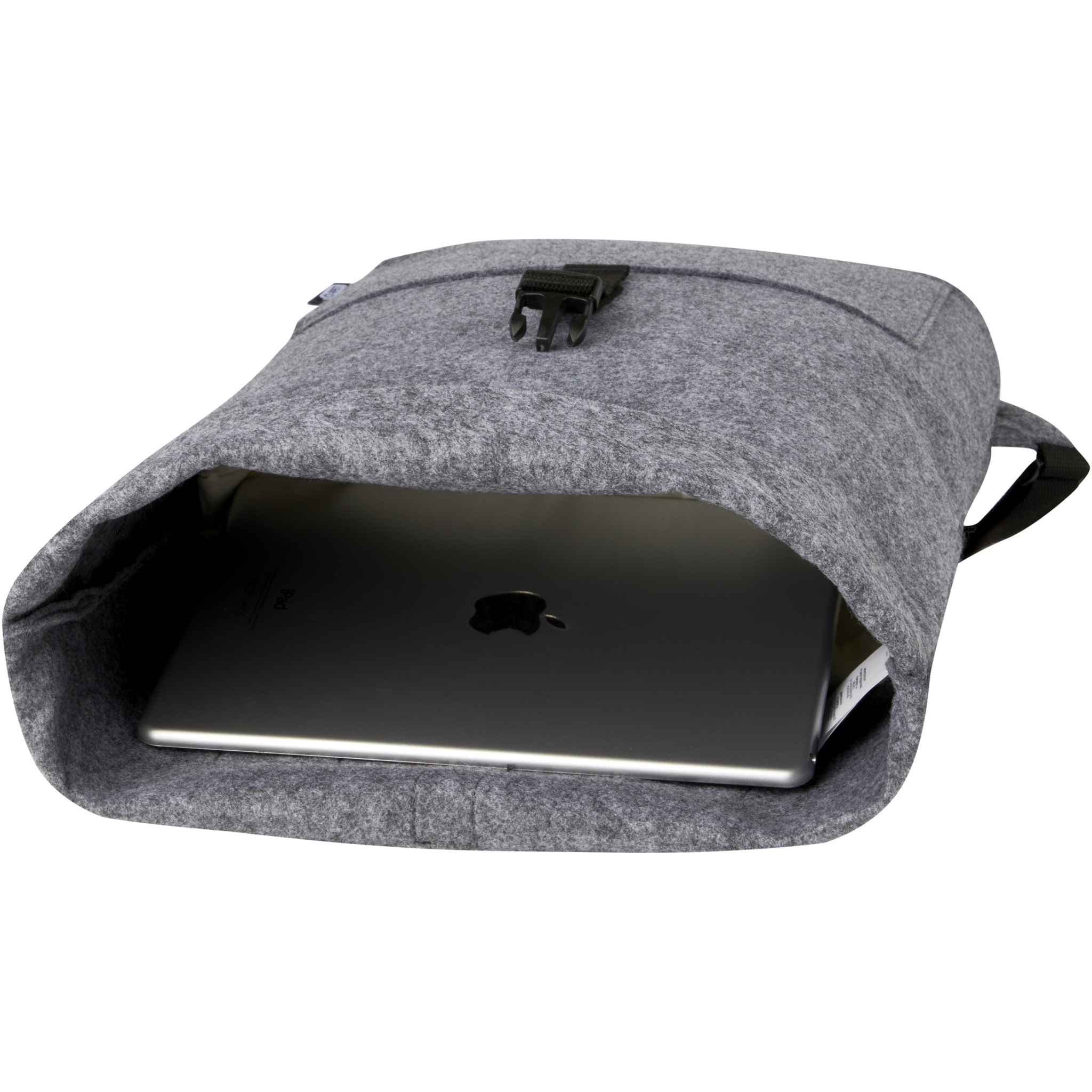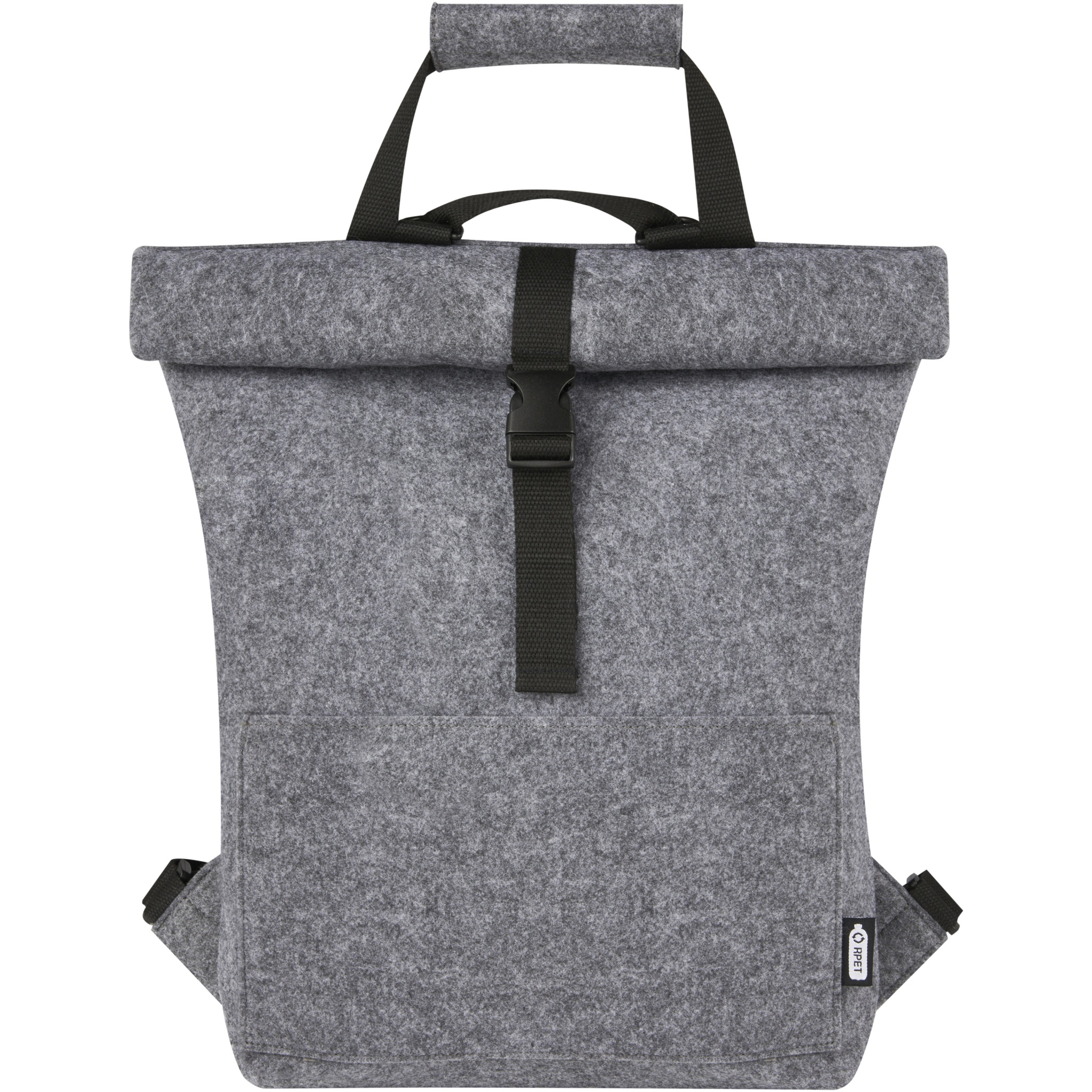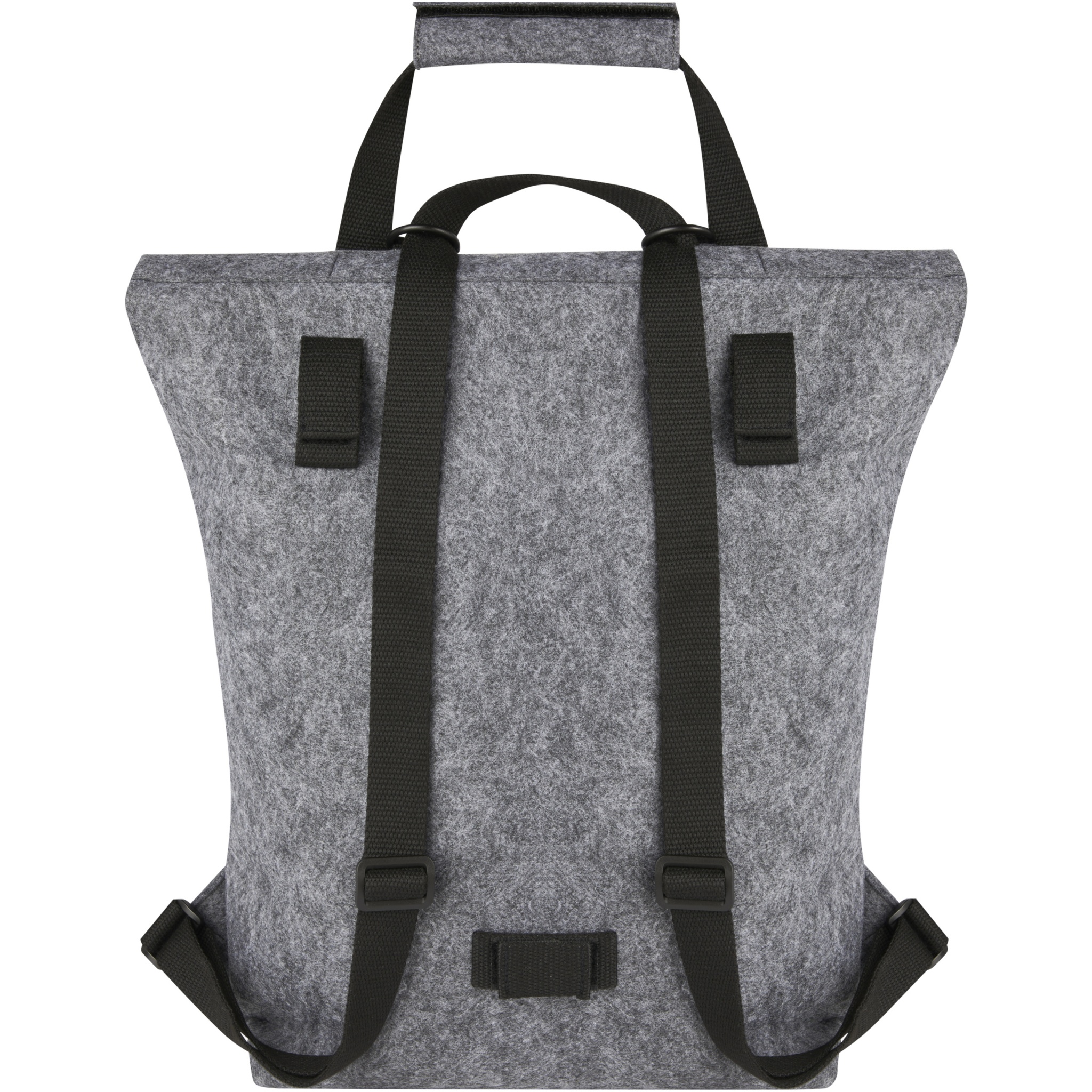 Multifunktionell och trendig kombinerad ryggsäck och cykelväska med rullöppning tillverkad av högkvalitativ, mjuk och hållbar GRS-certifierad återvunnen filt. Har ett stort huvudfack, framficka, justerbara axelremmar och tre kardborreband för att fästa väskan bak på en cykel. Axelremmarna kan enkelt göras om till ett system med långa bärhandtag eller buntas ihop så att remmarna inte fastnar i ett cykelhjul.