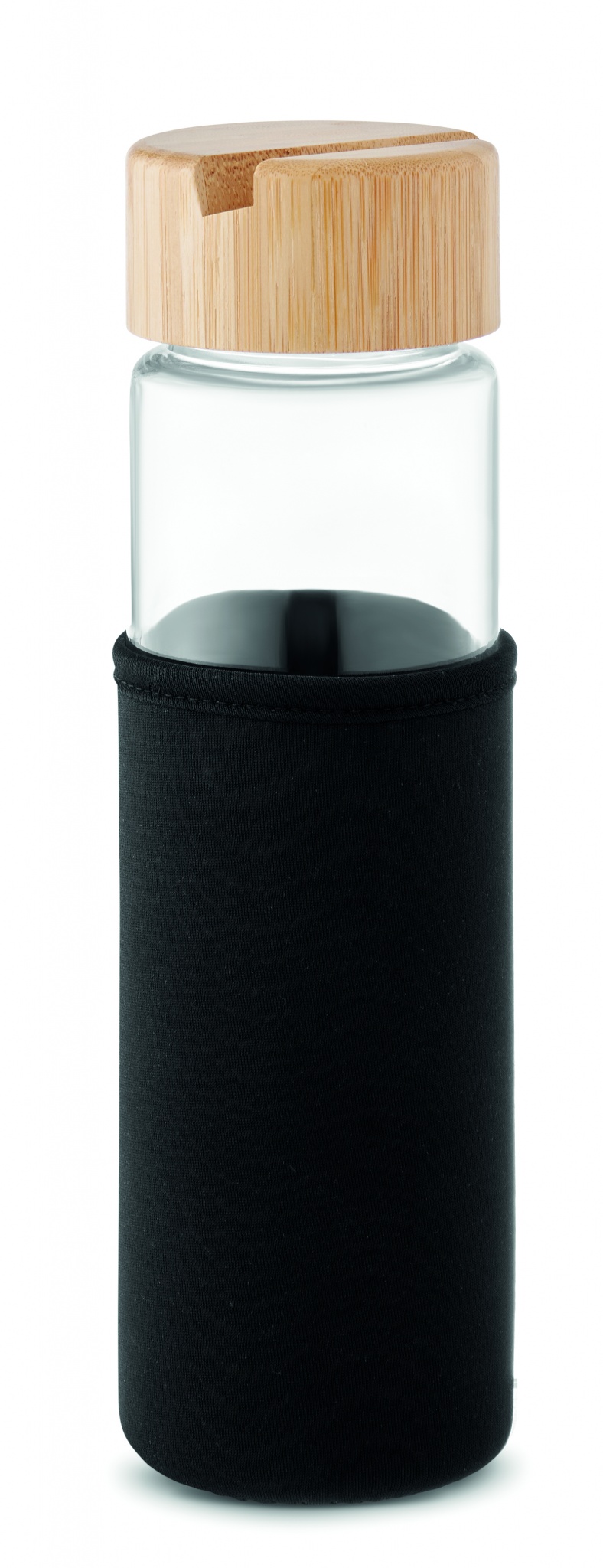 Glasflaska med lock i bambu, neopren fodral och funktionalitet för smartphone-stativ. Läcker inte. Kapacitet: 600 ml.