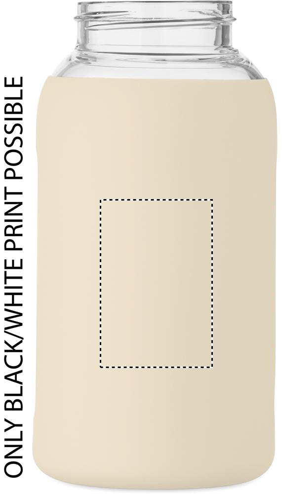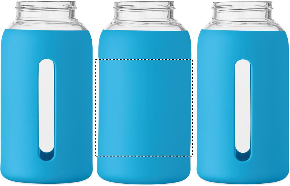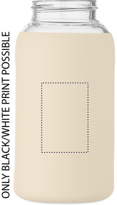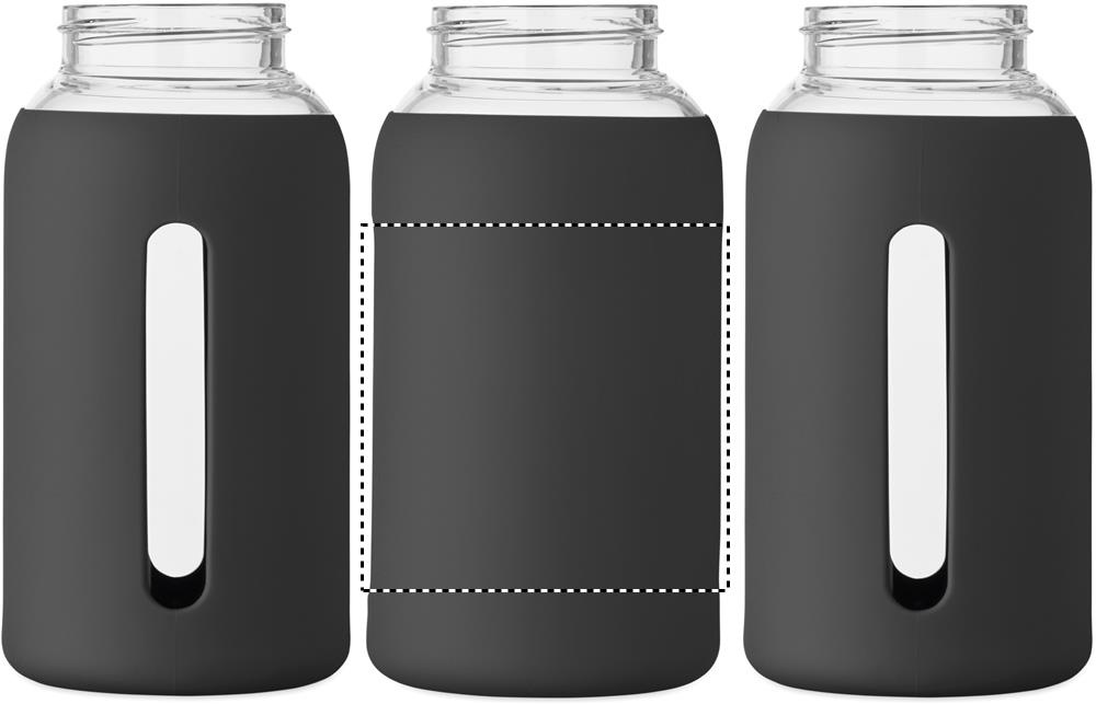 Flaska i borosilikatglas med silikonpåse och PP-lock med handtag. Volym: 600 ml