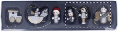 6 olika julgransdekorationer i trä som är förpackade i en presentkartong med transparent lock.
