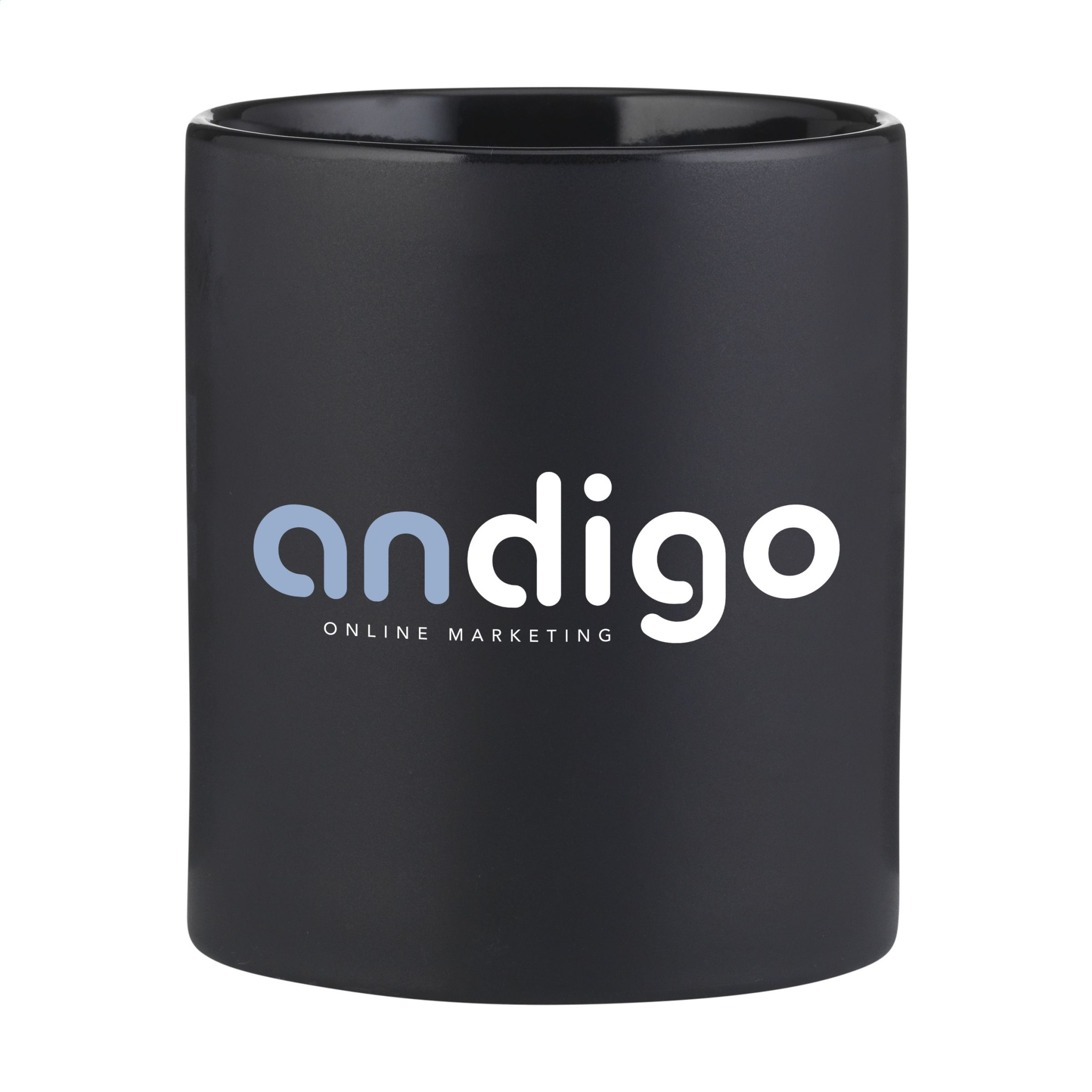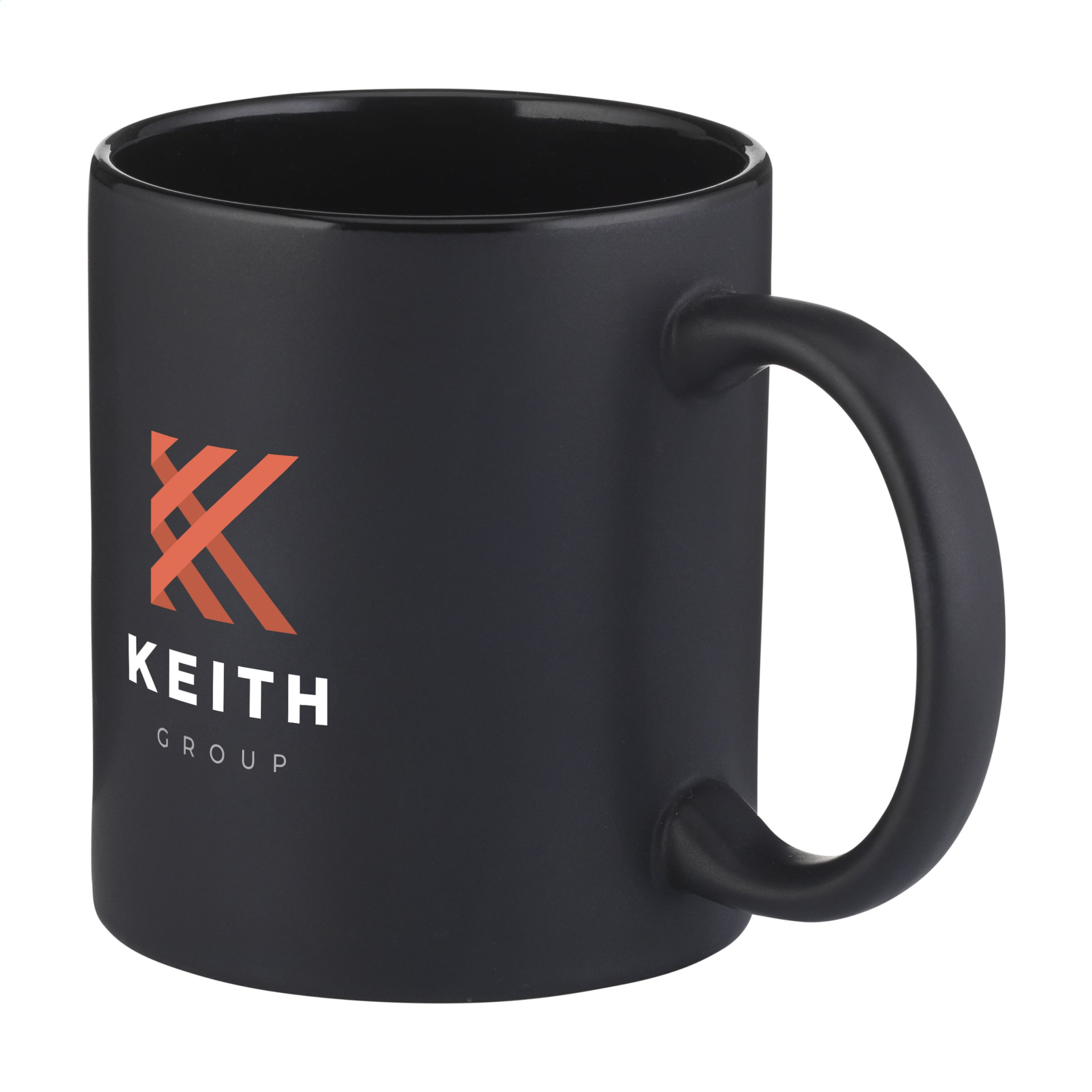 Högkvalitativ keramisk mugg med mattsvart utsida och blanksvart insida. Tål diskmaskin. Trycket är diskmaskinstestat och certifierat: EN 12875-2. Kapacitet 350 ml.