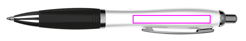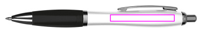 Kulspetspenna med vit cylinder, metallklämma, blå skrivpåfyllning med stor kapacitet och färgad soft touch gripzon. Vi trycker din logotyp på höger sida av klippet.