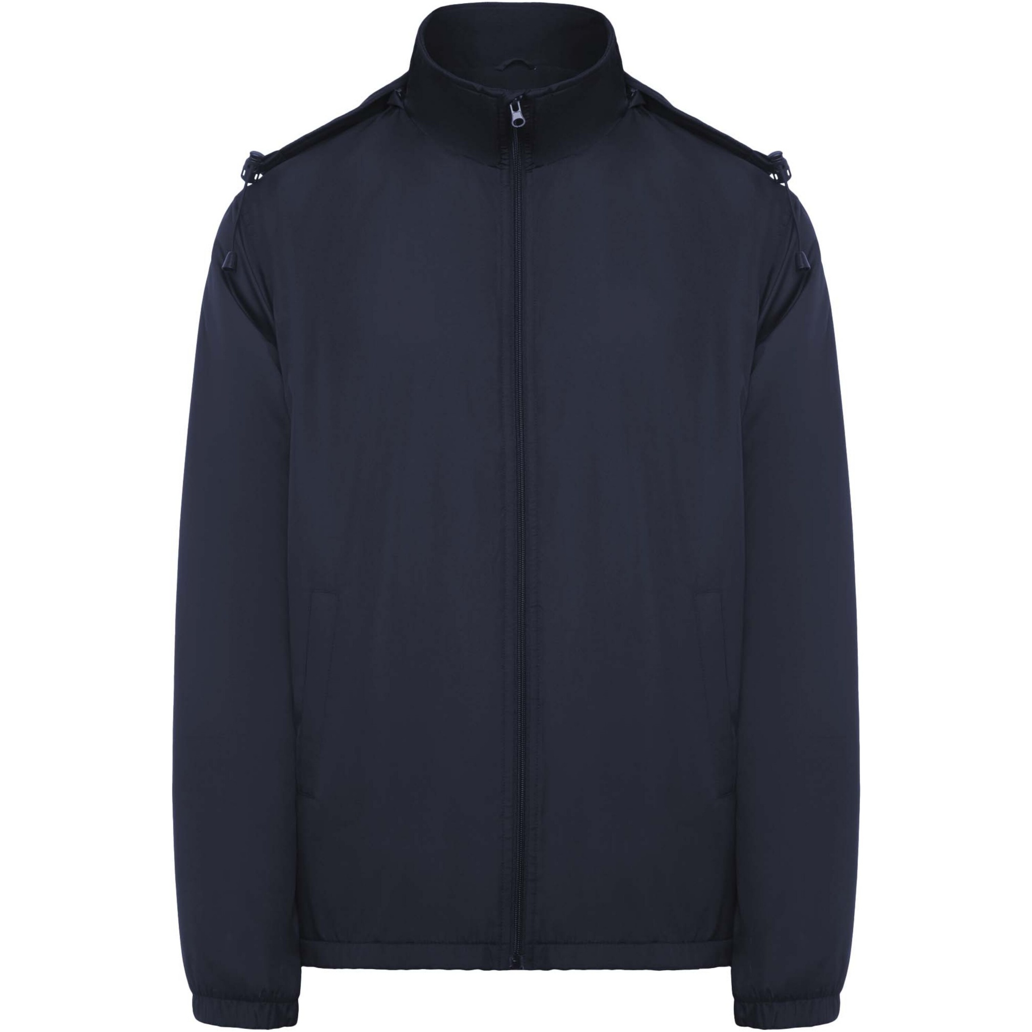 Lätt vattentät jacka. Hög krage och vikbar huva med dragsnodd. Foder i mikrofleece. Dragkedja fram och hakskydd. Elastiska muddar. Två sidfickor med dragkedja. Invändig bröstficka på vänster sida. Borttagbar etikett. Vattentät. Vindtät. Den manliga modellen är 184 cm och bär storlek L, den kvinnliga modellen är 174 cm och bär storlek S.