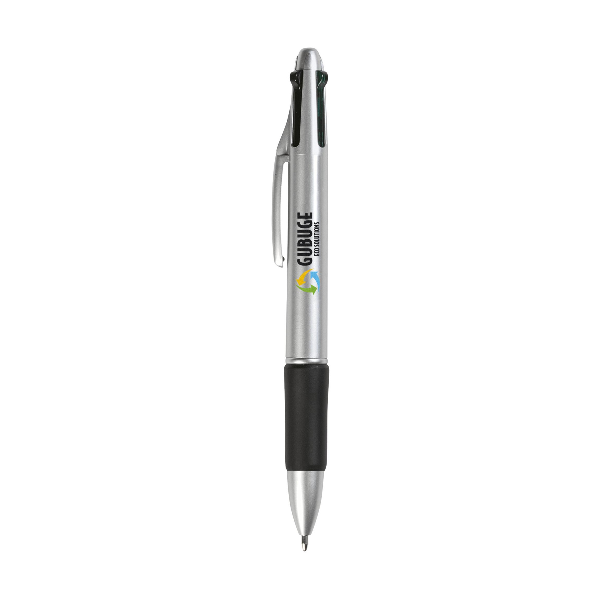 4-färgad kulspetspenna med halkfritt gummigrepp. Utrustad med blått, grönt, rött och svart bläck.