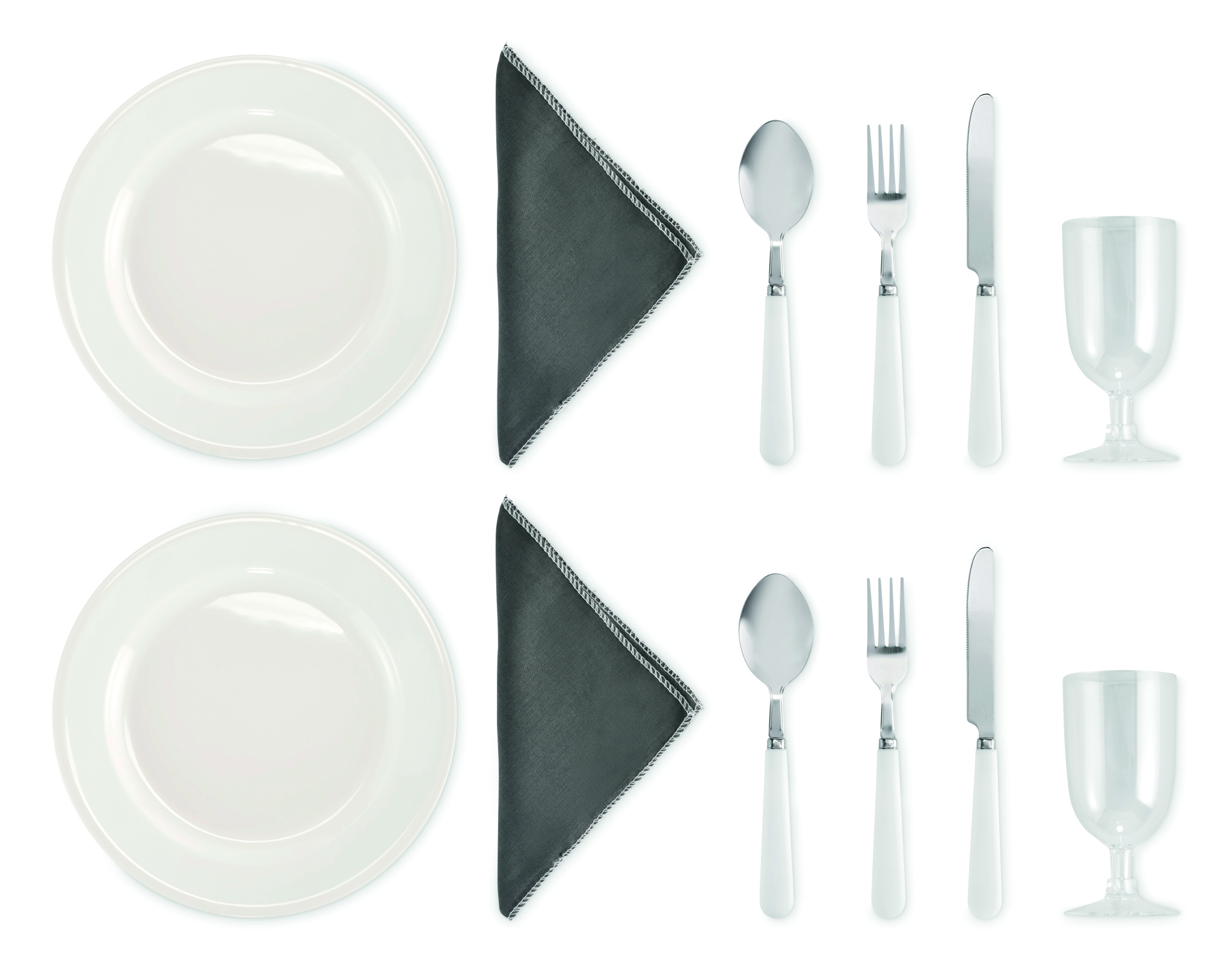 Picknickkylväska i 600D RPET-polyester för 2 personer med blixtlåsförsedd framficka inklusive bestick i rostfritt stål, 2 tallrikar i PS, 2 glas i PS och 2 bomullsservetter. Volym: 18L