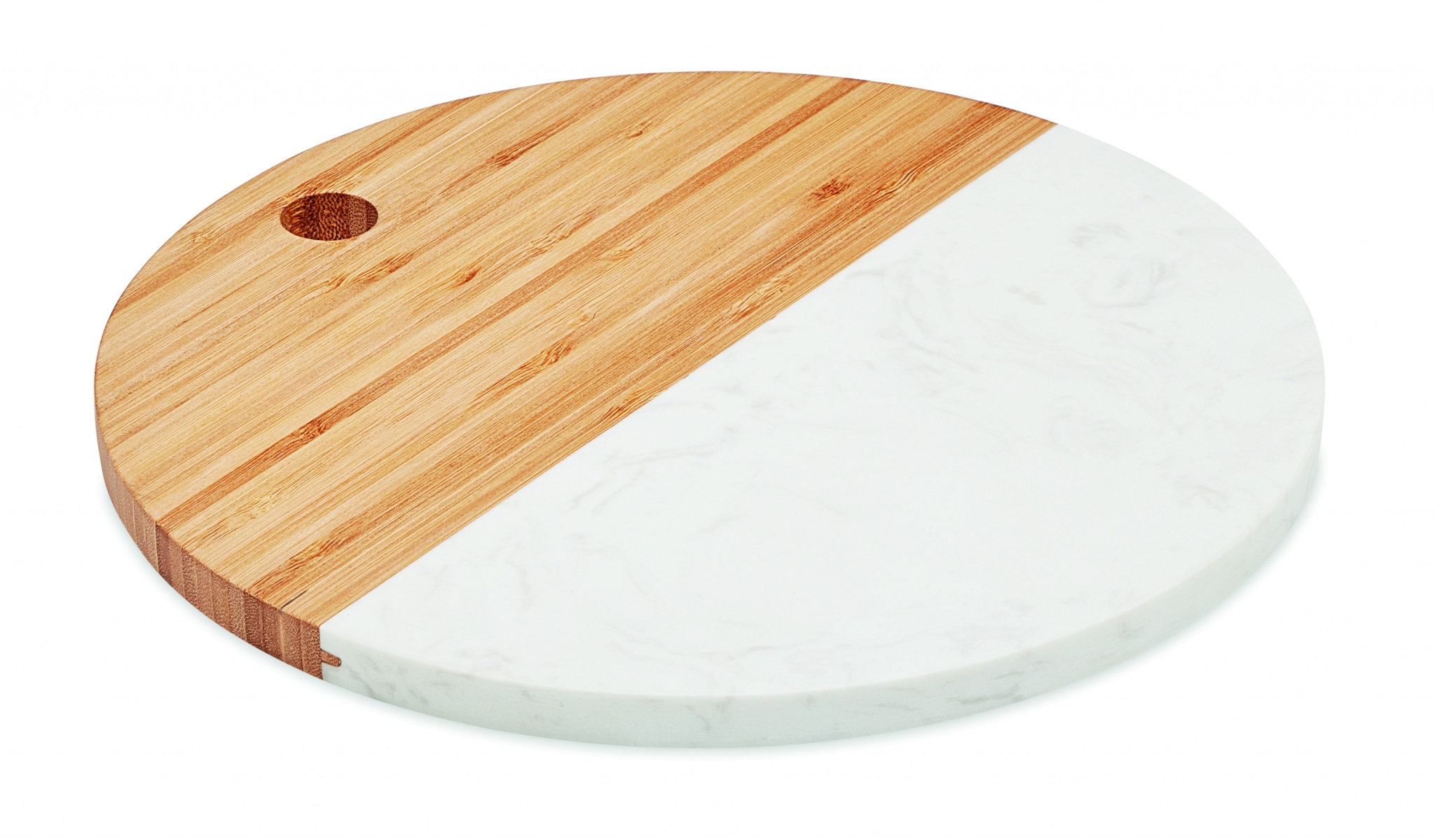 Serveringsbräda gjord av marmor och bambu. Denna runda serveringsbräda eller ostfat har ett lyxigt och hög kvalitetskänsla tack vare den vita marmorn. Bambudelen ger den ett mer naturligt utseende. Bambu är en naturlig produkt, det kan finnas små variationer i färg och storlek per artikel, vilket kan påverka det slutliga märkresultatet.
