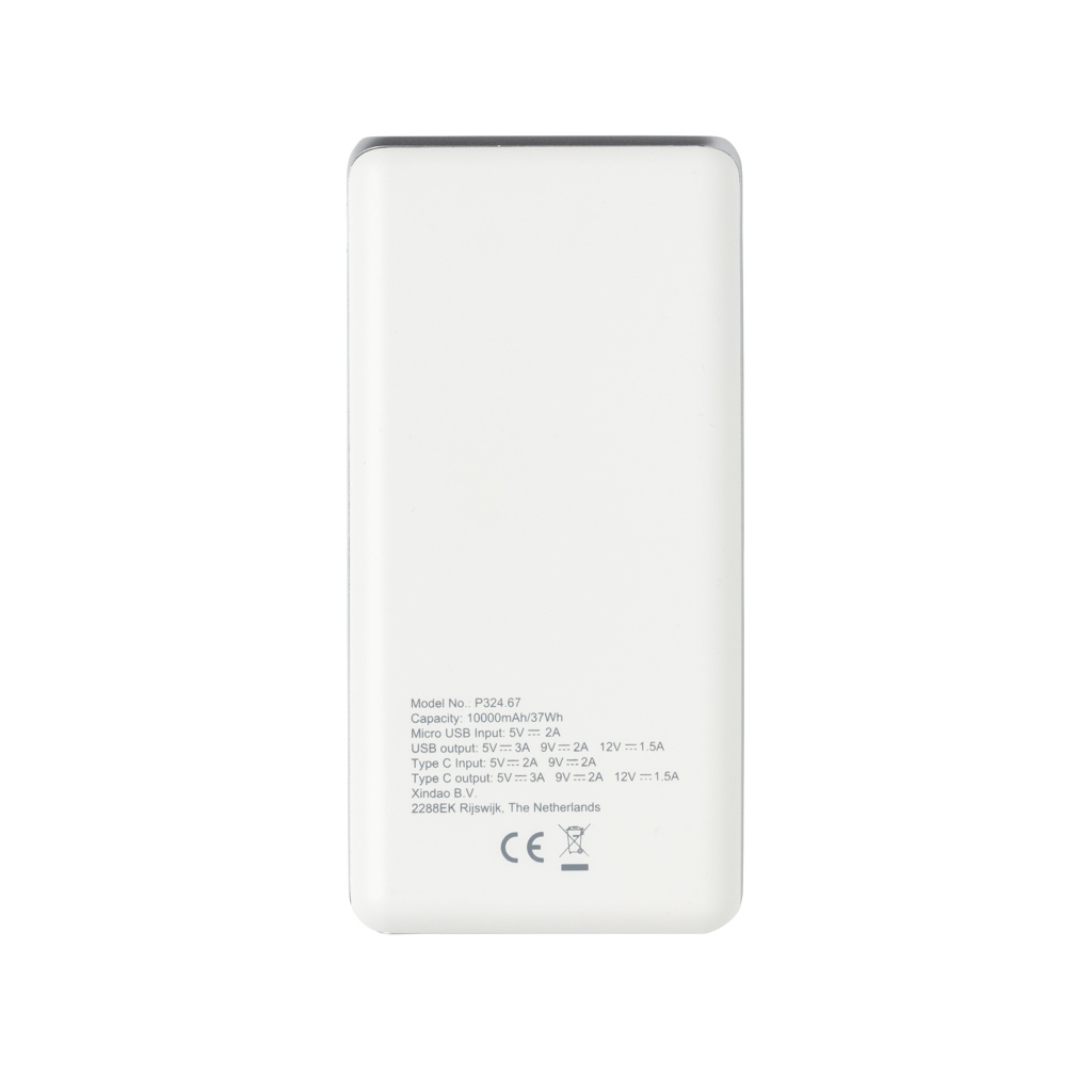 10.000 mAh powerbank med snabbaste laddningen som finns tillgänglig. Tillverkad av ABS. Med type C port för iPhone och MacBook(max 18W) och vanlig USB port. Micro USB input: 5V/2A. USB output: 5V/3A 9V/2A 12V/1.5A. Type C input: 5V/2A 9V/2A. Type C output: 5V/3A 9V/2A 12V/1.5A.