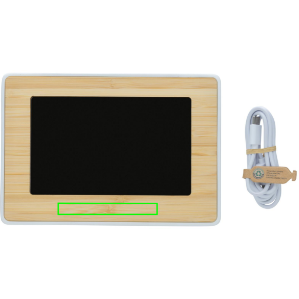 Stor klocka tillverkad av av RCS (Recycled Claim Standard) certifierad återvunnen ABS och FSC® 100% bambu. Totalt återvunnet innehåll: 76% baserat på total produktvikt. RCS certifiering säkerställer en helt certifierad leveranskedja av de återvunna materialen. Med högkvalitativ LED skärm. Funktioner: klocka, alarm, snooze, temperatur, 12/24 timmar alternativ. 100cm type C laddningskabel i RCS certifierad TPE medföljer. Levereras i FSC® mix kraft förpackning.