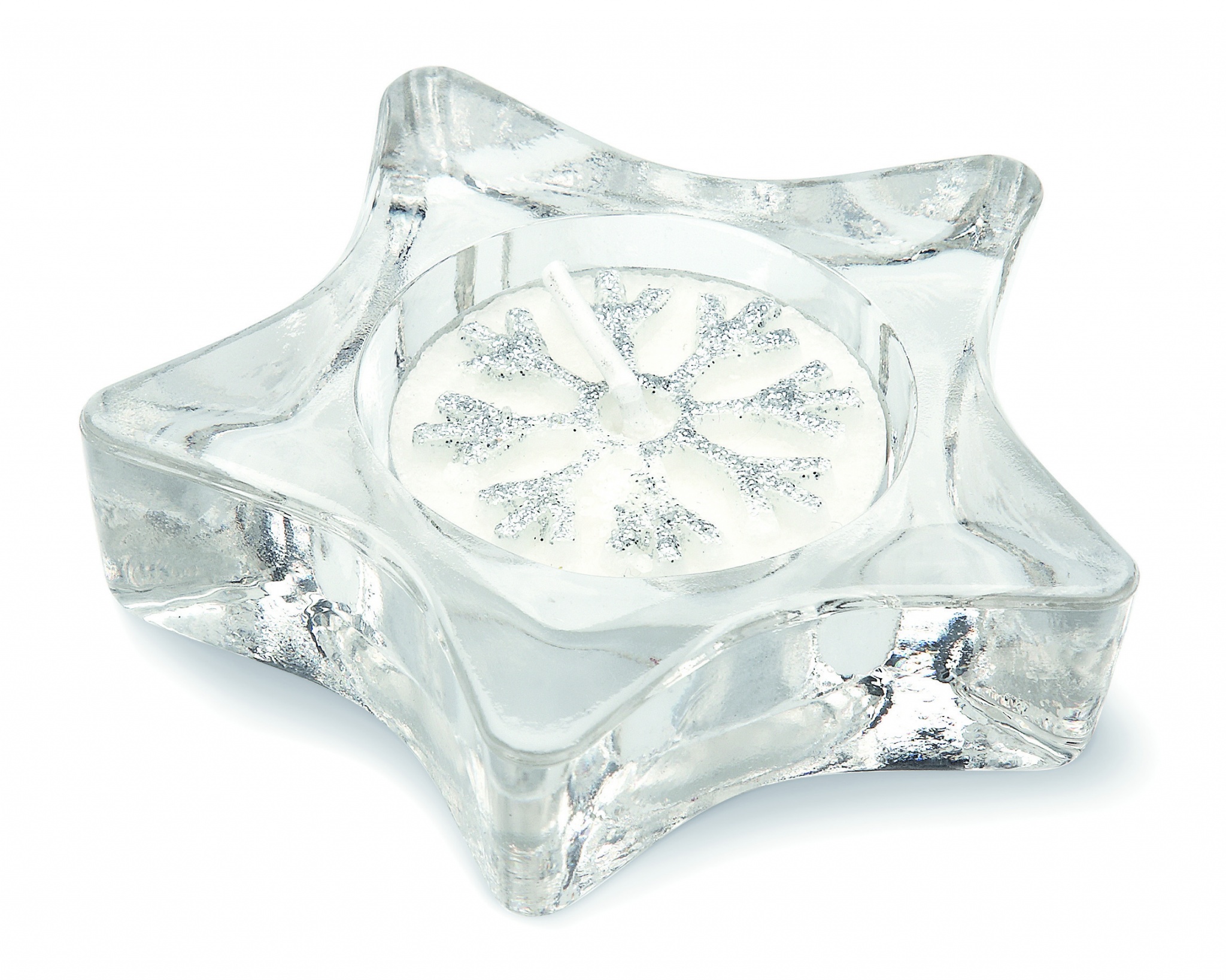 Stjärnformad värmeljusstake . Presenterad i silverfärgad presentask med transparent lock och dekorband. Glitterdekorerat värmeljus ingår.