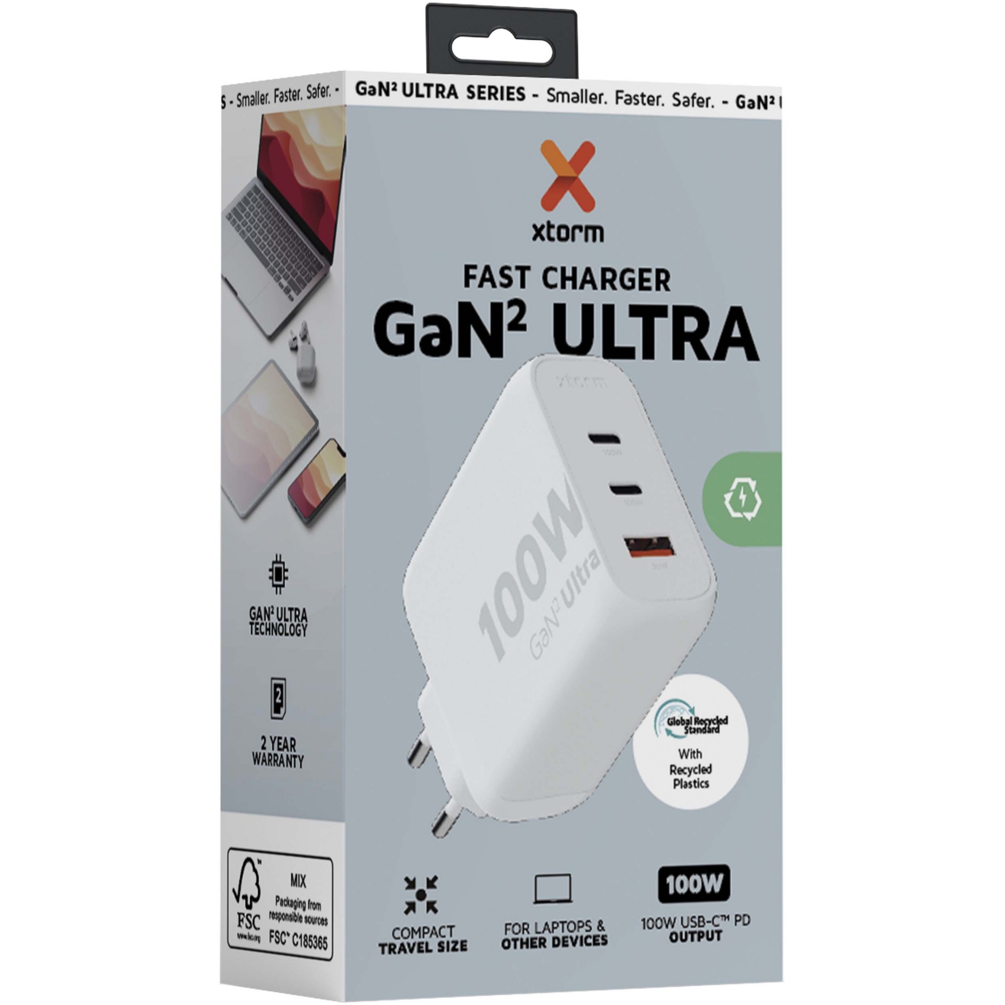 Väggladdaren GaN² Ultra på 100 W är utformad för att vara mer kompakt och kraftfull än någonsin tidigare. Med den kompakta designen och treportsfunktionen är den här väggladdaren perfekt på resor, kontoret eller för hemmet. Laddaren är tillverkad av 97 % återvunnen plast för att minska avfallet och bidra till en mer hållbar framtid. Utgång 2 x USB-C 100 W strömförsörjning och 1 USB-A 18 W snabbladdning 3.0. Levereras med en användarhandbok.